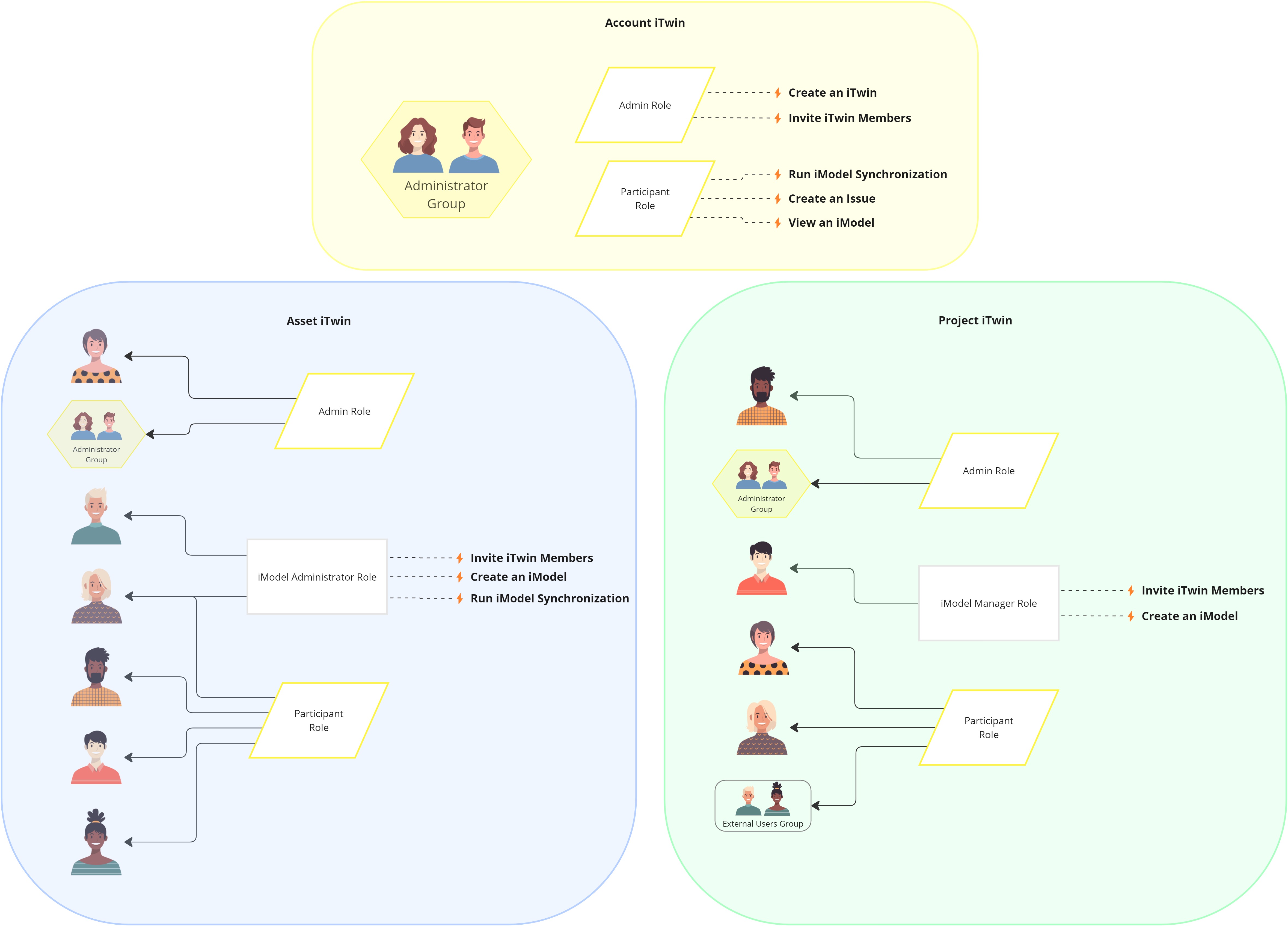 The Account iTwin offers robust capabilities. With the Account iTwin, roles and groups are defined in a centralized manner for the entire account and can be assigned on any iTwin owned by account. This ensures consistency in access control across iTwins and makes it easier to manage common personas and groups of individuals across multiple iTwins.